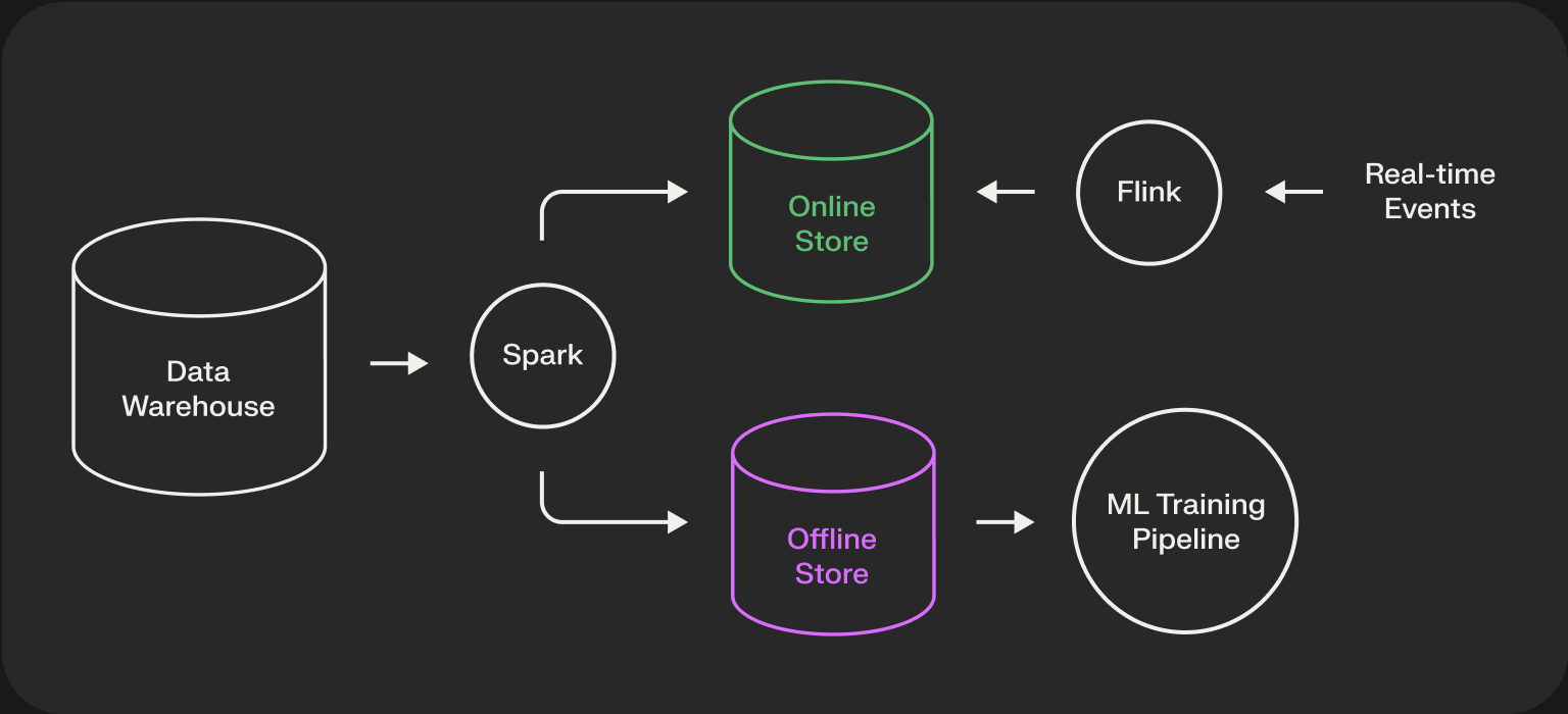 - Online Store: A low-latency, real-time key-value store (e.g., Redis, DynamoDB). This is used by the online recommender system to fetch fresh features for inference in milliseconds.