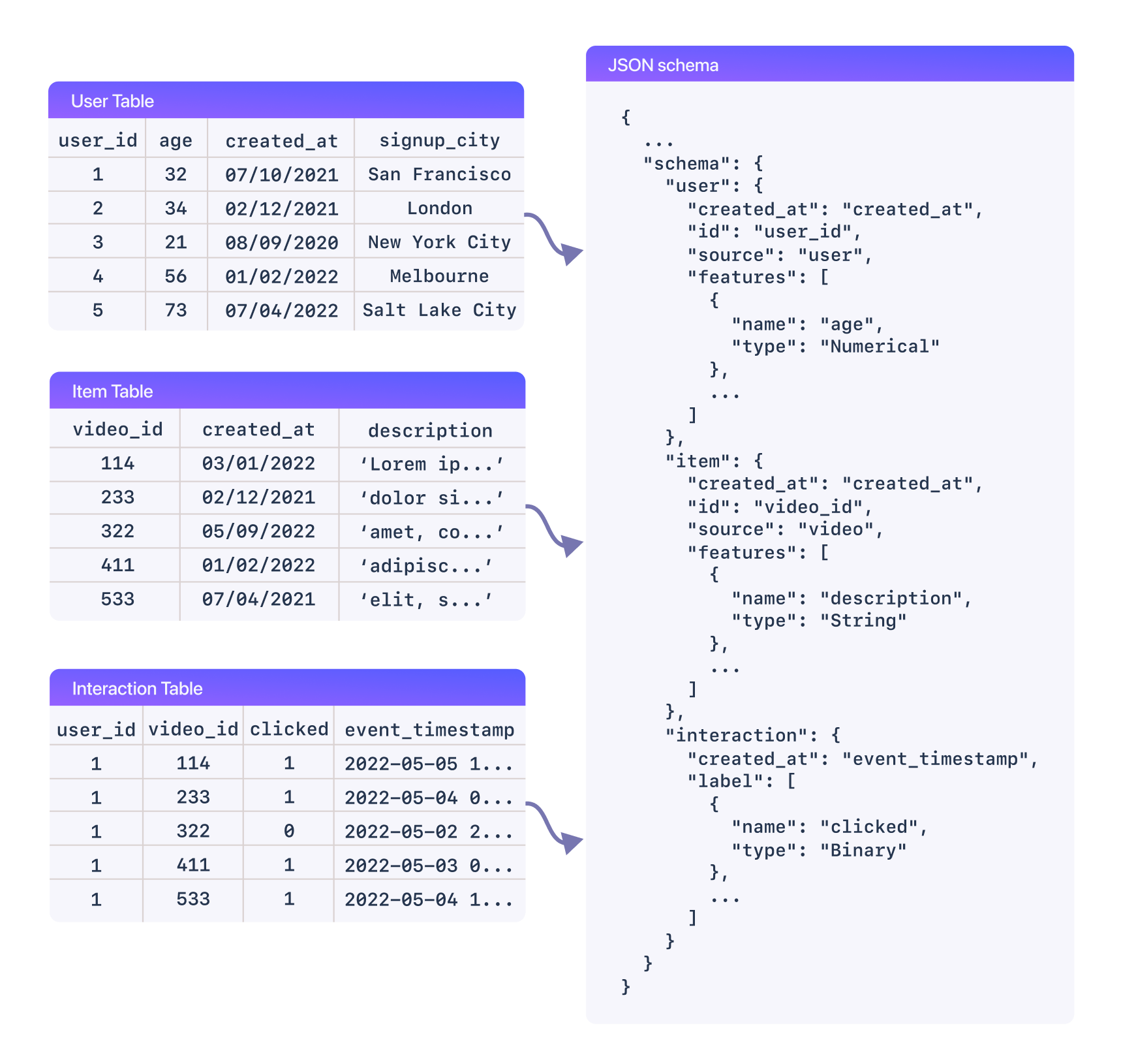 For example, say you want to build a video recommendation model. You have three relevant tables stored in your BigQuery data warehouse:
