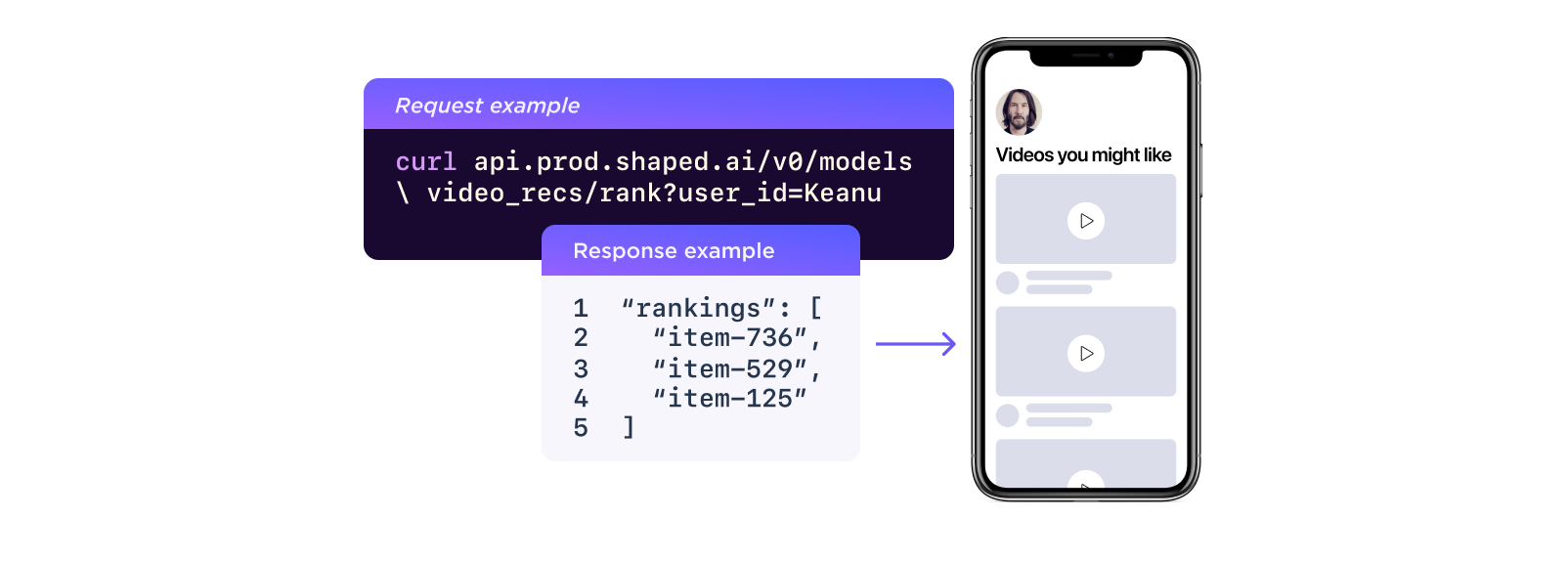 Here’s an example curl request fetching several ranked videos for the user with id “Keanu”. The response is a list of the most relevant video ids for Keanu.