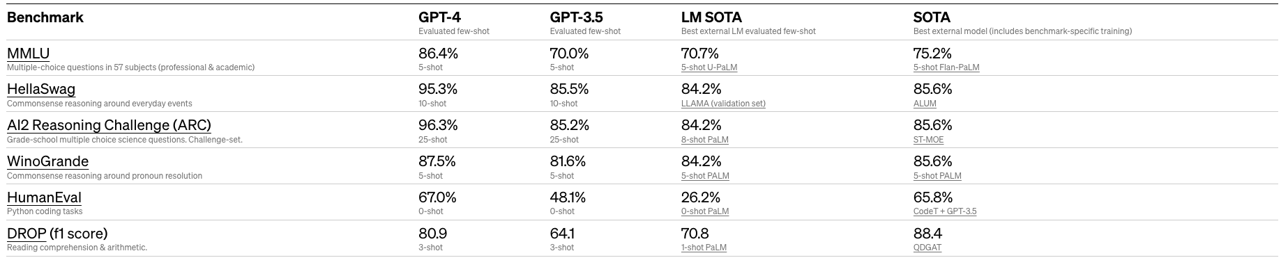 GPT-4 scored high on traditional machine learning benchmarks, outperforming existing large language models.