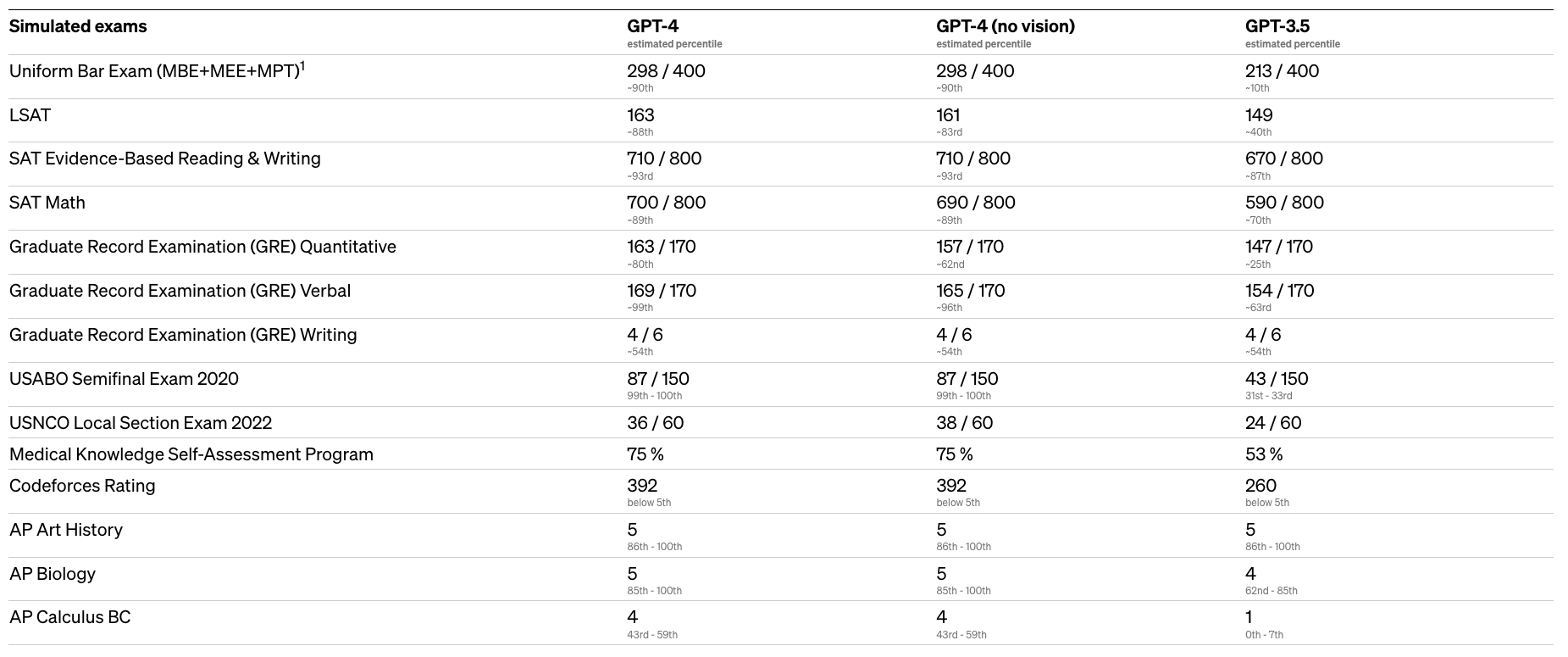 OpenAI tested them on a variety of benchmarks, including simulating exams that were originally designed for humans. They tested GPT-4 using the most recent publicly-available tests (in the case of the Olympiads and AP free response questions) or by purchasing 2022–2023 editions of practice exams. OpenAI did no specific training for these exams. A minority of the problems in the exams were seen by the model during training, but they believe the results to be representative.