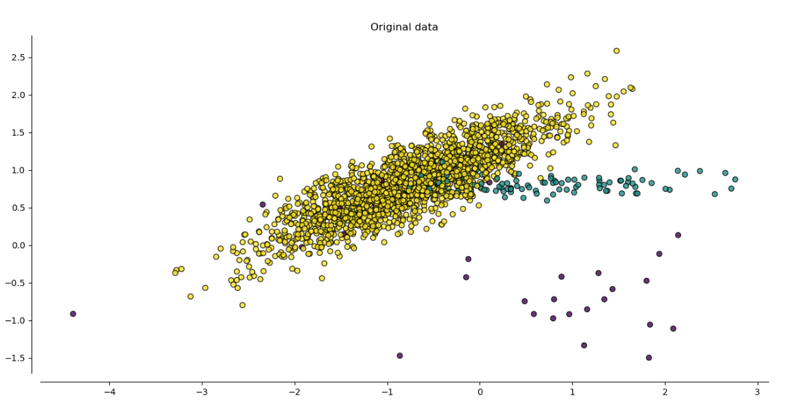 Let’s consider the data above as original data to showcase different techniques of generating synthetic data. We have 3 classes, yellow is the majority and the rest are minorities. We will show you how the generation methods affect the number of samples.
