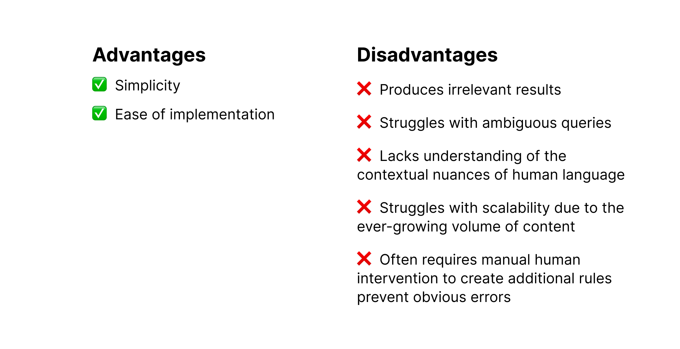 Keyword-based search relies on explicitly matching keywords from user queries to the data with rules. These rules typically include factors like keyword frequency, location, and the presence of related terms.