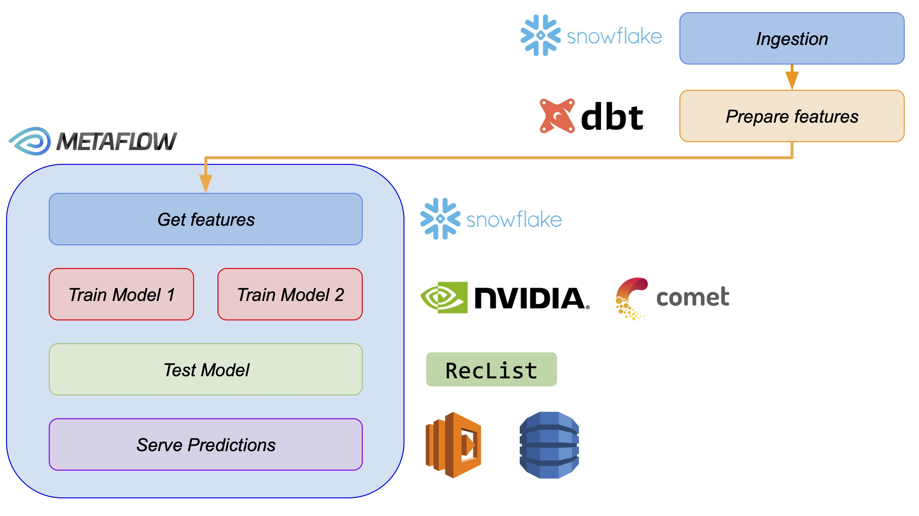 Our infrastructure shares some core designs with the one seen in this tutorial. We support data ingestion from different data warehouses and create the necessary pipelines to give life to a recommender system.