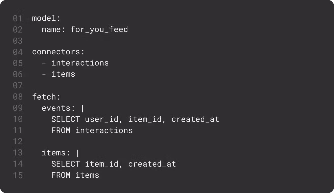 Define your feed in minutes with a simple config—no custom ML models or tuning cycles. Shaped handles the hard parts for you.